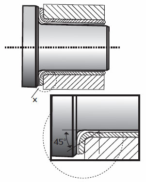 關于翻邊套,從翻邊套口到軸向轉換組件必須考慮半徑的轉變,切面要有—個足夠大的倒角。以防翻邊套口聚集污垢后仍然可以支持軸向載荷部件的邊緣。